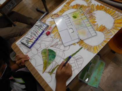 ひまわりの絵を描いています。コンテと絵の具を使って表現し,工夫して彩色しています。