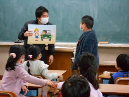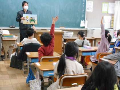知らない人に声を掛けられ,「道がわからないので車に乗って教えてほしい」と言われたら,どうすればよいのでしょうか。ロールプレイをしながらみんなで考えています。