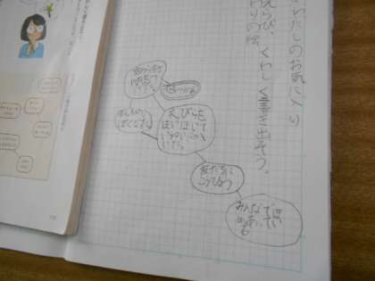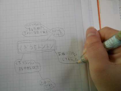 1年間に学校でつくった作品の中で,一番気に入っているものを紹介する文章を書きます。材料を集めるために,ウェビングマップをかいています。