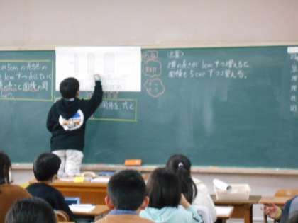 表を見て,2つの量の関係を式に表します。たての長さが5センチメートルの長方形の横の長さと面積の関係はどのように表せるでしょうか。