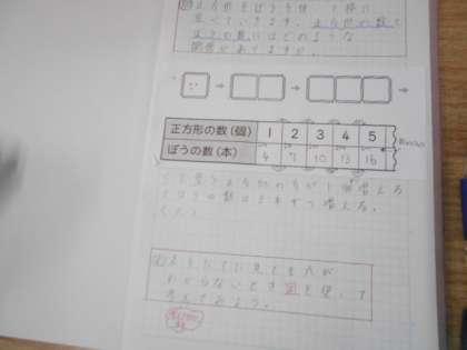 棒を並べて正方形をつくります。正方形の数と棒の数の関係を式であらわすと,どのようになるのかを考えています。