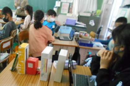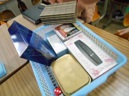 家から持ってきた箱を分類します。色や材質,重さなどで分けています。形に着目して分類するとどのようになるでしょうか。