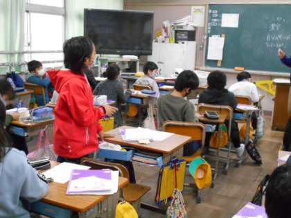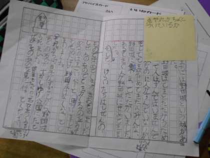 野田のまちの昔や今について調べた子どもたち。人に知ってほしいこと,自慢だと思うことを文章でまとめます。友だちと読みあって,いいなと思うところやアドバイスしたいところをカードに書きます。