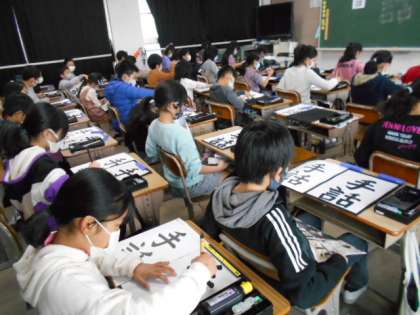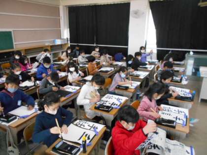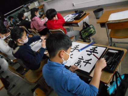 4年生のまとめとして「手話」という字を書きます。とめ,はね,はらいなど色々なことに気を付けて注意深く書くことができました。
