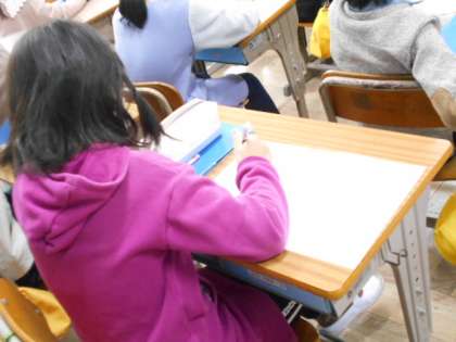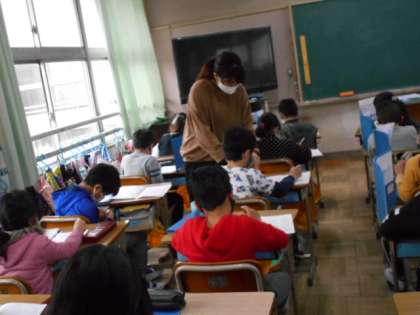 かけ算プリントの答え合わせをしています。答えを全員で復唱しながら進めています。