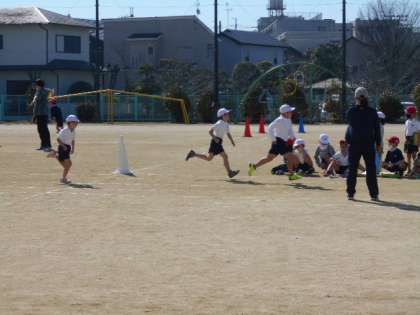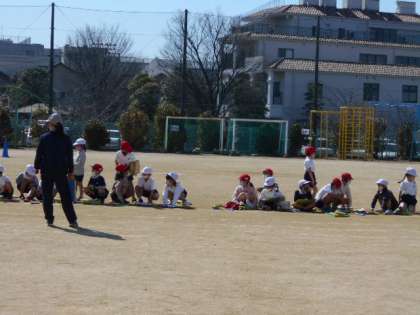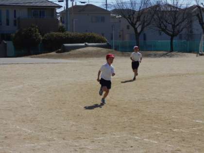 良いお天気の中,1年生が,かけあし運動を行っています。時間内にどれだけ走れるでしょうか。ペアの人と一緒に周数を数えます。