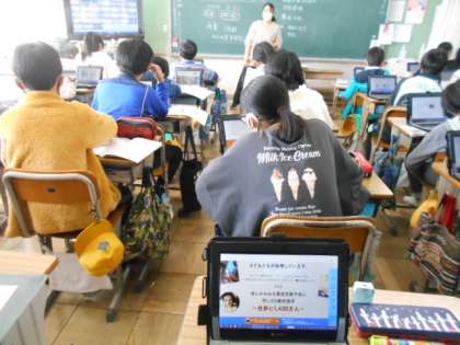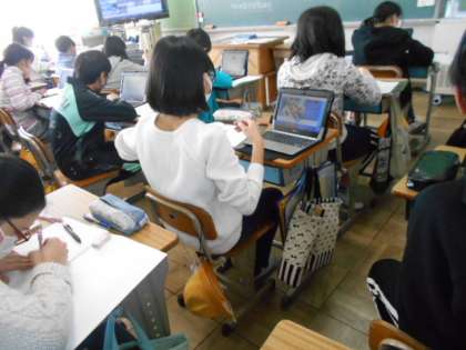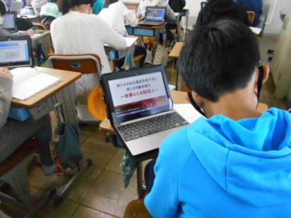 「ユニセフ」についてインターネットで調べます。一人一台の児童用パソコンを使っています。