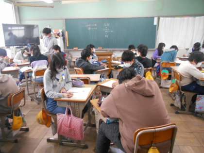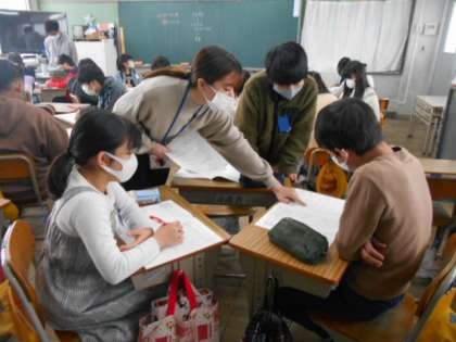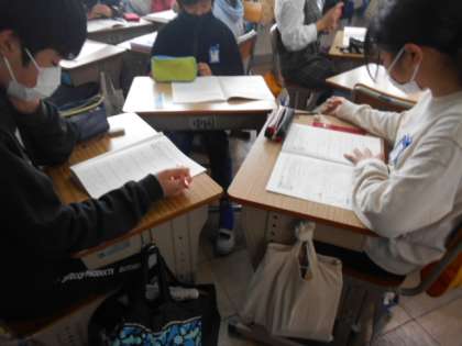小学校の学習の振り返り教材である「中学への道」に取り組んでいます。友だちどうし,教え合いながら進めています。