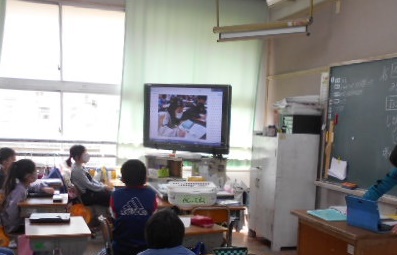 野田の昔や今について調べ「まちのじまん」をまとめた3年生。御池台小学校の友だちと総合的な学習の時間の取組を交流します。リモート会議システムを使って行います。御池台小学校の人たちは,堺かるたを作ったようです。その様子をモニターで見ています。