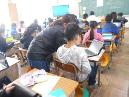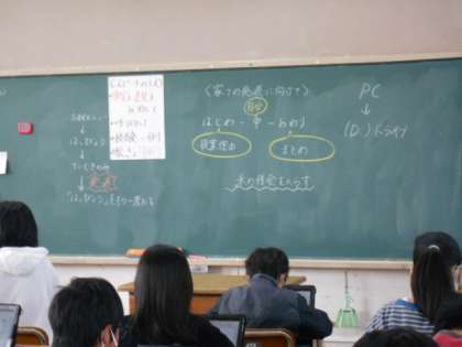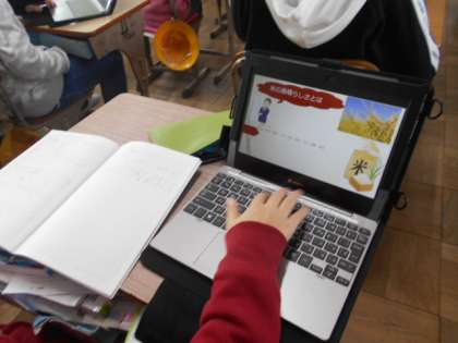 米のよさをお家の人に伝えるためにパワーポイントに調べたことや体験したこと,考えたことなどをまとめています。家での発表の仕方についても考えています。