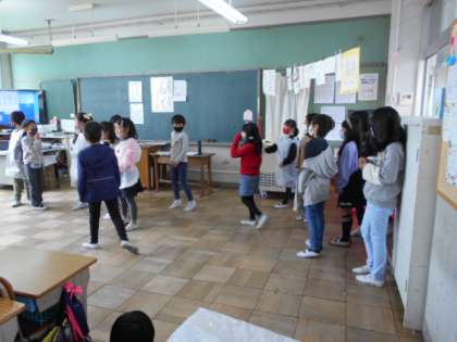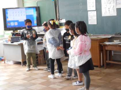 「We are!!」の劇がだんだん仕上がってきました。どの立ち位置でどのようにセリフを言うとよいのか,考えながら練習しています。