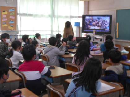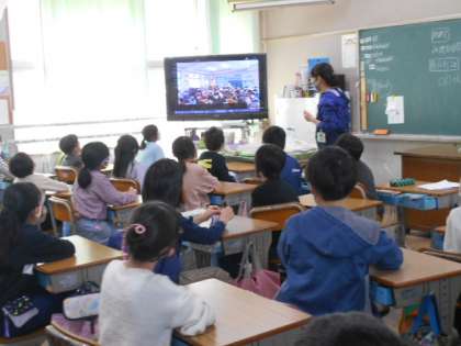 御池台小学校のと友だちとリモートでの交流をする3年生。今日は2組と4組でカメラテストをしています。