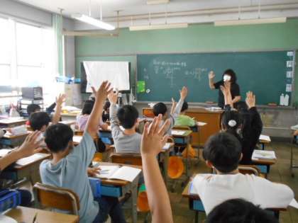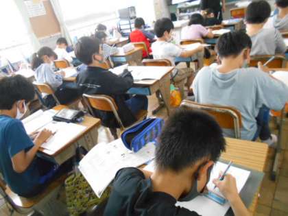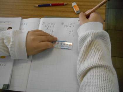 あまりのある割り算をしています。筆算で答えを求めています。わかりやすいノートづくりにも心がけています。