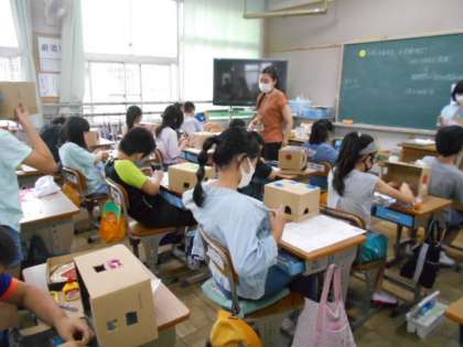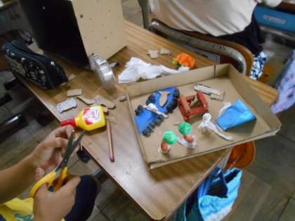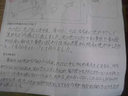 覗いてみると,はこの中には不思議な世界が広がっています。作品ができあがった人は,自分の作品の見どころをワークシートに書いています。