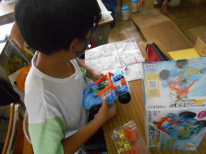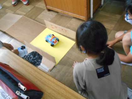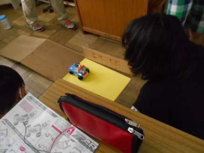 車を作って動かします。3年生の風やゴムの力と違って,4年生では電気の力で動かします。坂も走らせてみます。