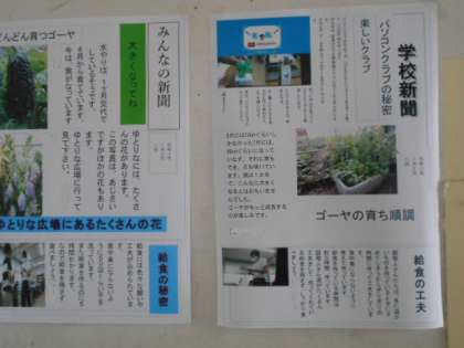 学校に関する題材を選び,先生にインタビューした内容を取り入れて新聞を作ります。伝えたいことを明確にし,パソコンを使って上手にまとめています。