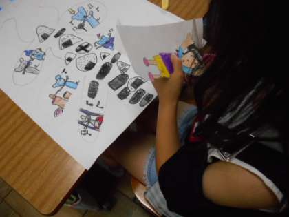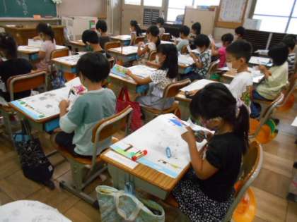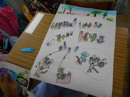 土の中におむすびが転がって入りました。中ではネズミたちが楽しそうにしています。その世界に自分が入っていったら・・・と想像しています。