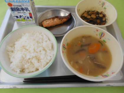今日の給食には「鮭の利休焼き」という料理がありました。堺にゆかりのある茶人の千利休がゴマをまぶした料理を好んだ。という説から,このような名前がついたとされています。