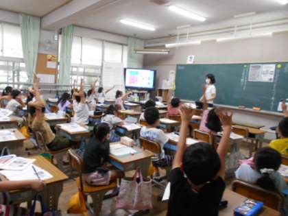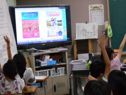 2種類のポスターを見て,同じところや違っているところを見付けます。催しの場所や日付,電話番号などはどちらにもありますね。