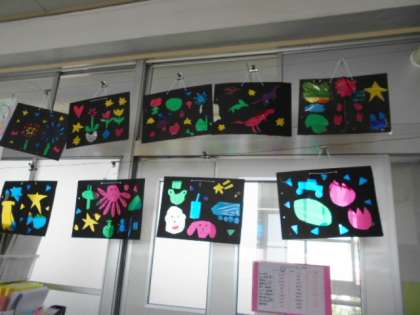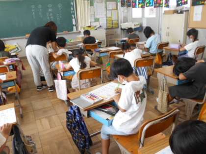 書写プリントを丁寧に書いています。できあがたら色塗りをします。図工の時間につくった作品がとてもきれいですね。
