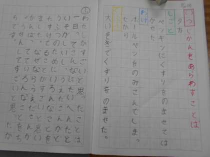 お話を読んでどんなことを考えたでしょうか。驚いたことや,感動したことなどを理由を添えてノートに書きます。