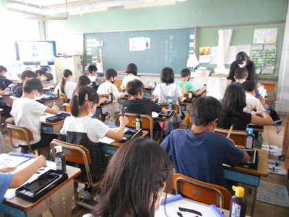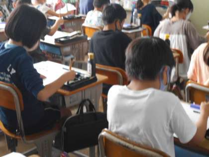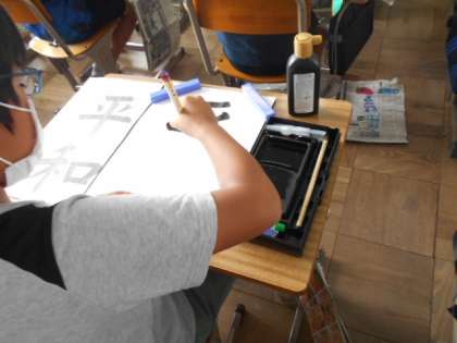 毛筆で「平和」と書きます。文字のバランスに気を付けています。