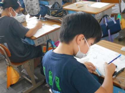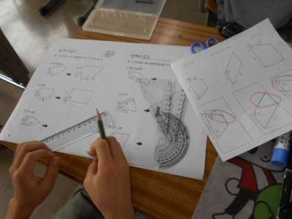四角形の作図をしています。できたら先生にチェックしてもらいます。