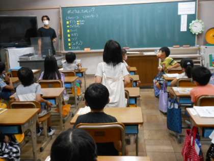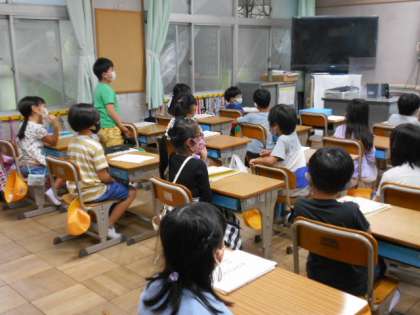 小学校生活の楽しさや成長することのよさに気づいた主人公の姿を通して、学校で楽しく過ごすことについて考え、小学校生活を楽しもうとする心を育てます。学校でどんなことをするのが楽しいかをたくさん話しています。