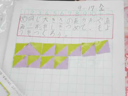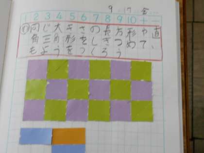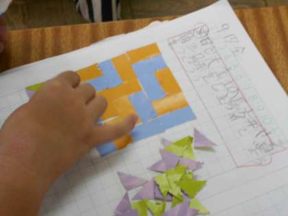 同じ形の長方形や直角三角形を敷き詰めています。どんな模様ができあがるでしょうか。