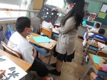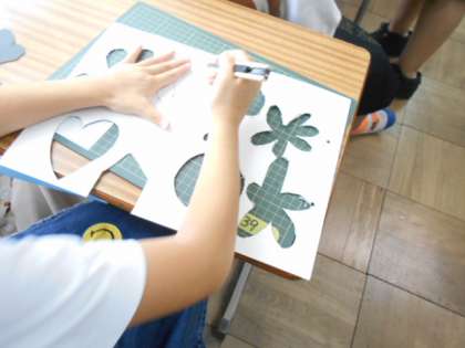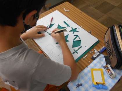 カッターナイフを使って,一生懸命画用紙を切り抜いています。丸い線やギザギザの線にも挑戦しています。