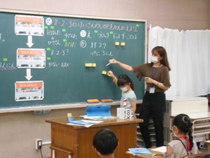 電車に8人乗っています。まずに2人降りて,次に3人降りると,何人乗っていることになるでしょうか。○図やブロックなどを使って「8−2−3」の計算の仕方を考えます。