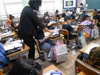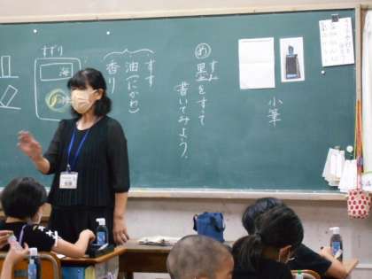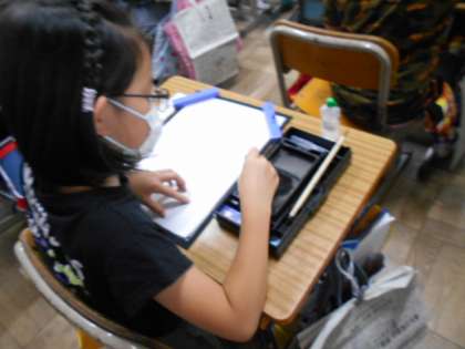 墨を使って書きます。水を入れて硯で墨をすって,文字を書きます。墨をすると本格的な感じがしますね。