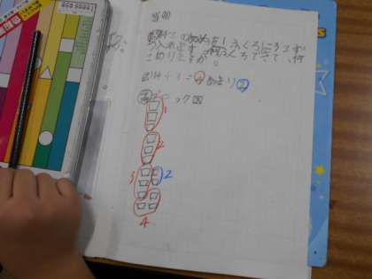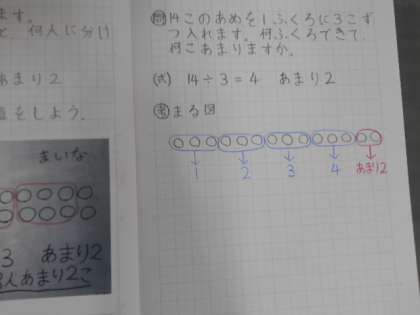 14個のあめを3個ずつ袋に入れます。何袋できて,いくつあまるでしょうか。図をかいて考えています。