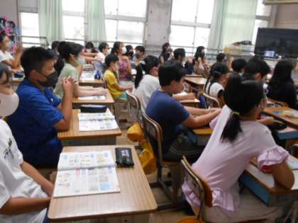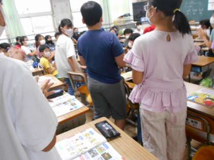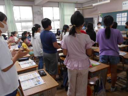 「I can〜」「I can't〜」の表現を使って,自分のことを話しています。手拍子に合わせリズムよく順番に話しています。