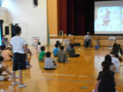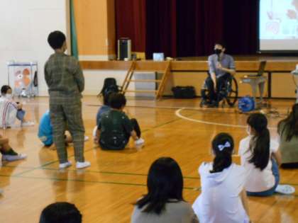 仕事や自分の将来について考えている6年生。車いすバスケットをしている方に来ていただきお話を聞いています。「車椅子バスケットを始めたきっかけは?」など質問もしています。