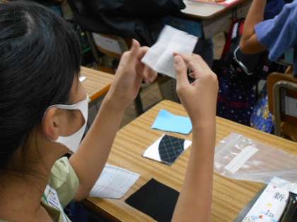いろいろな材質の生地を見たり,触ったり,引っ張ったりして特徴を感じ取っています。これからミシンを使った学習が始まります。