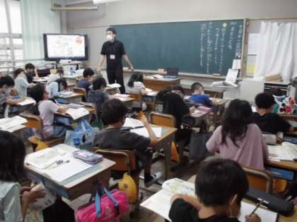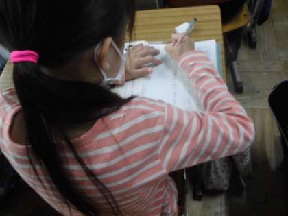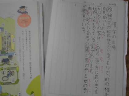 絵の中の町に住んでいるつもりで街の様子を説明する文章を作ります。教科書にのっている漢字を使います。