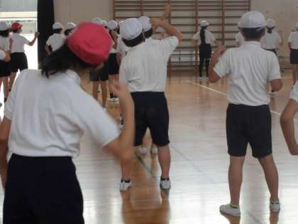 団体演技の練習をしています。リズムに合わせて動きます。みんな楽しそうです。