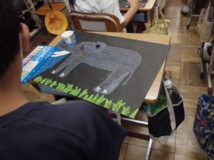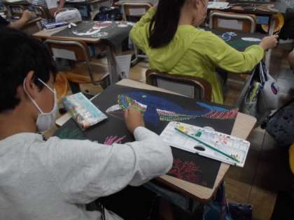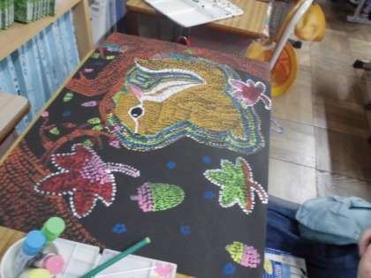 黒い画用紙に,棒の先に絵の具をつけてスタンピングしていきます。根気良く丁寧に作品をつくっています。出来上がりがとても楽しみです。