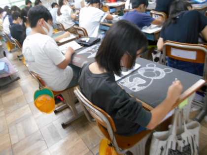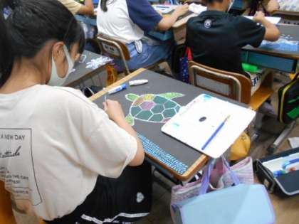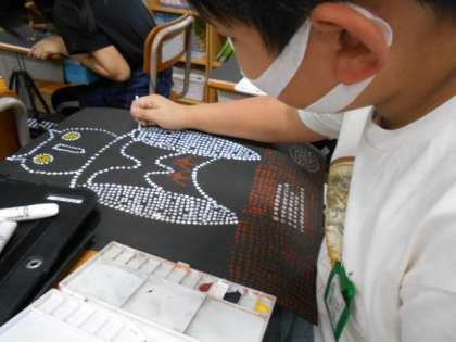 綿棒の先を上手に使い,丁寧にスタンピングしています。いろいろな生き物が表現されています。