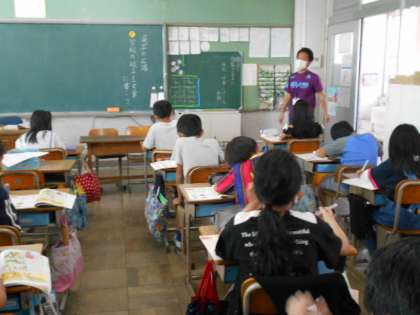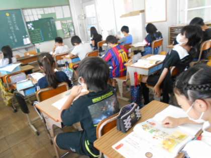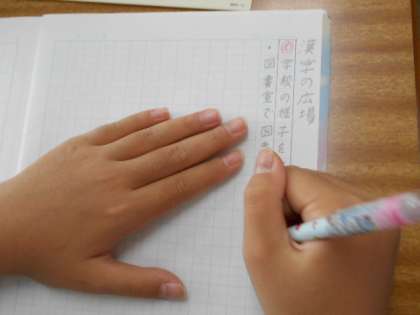 学校の中の様子をイラストをもとに紹介します。漢字の広場にのっている漢字を使って文章を作ります。