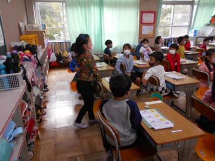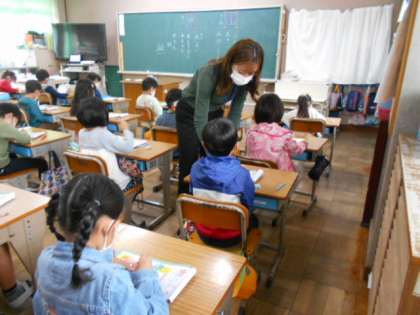 「山」と「水」を習っています。習った漢字を使った言葉を見つけて発表しています。「水よう日に水をのむ」という文章を考えた人もいましたよ。