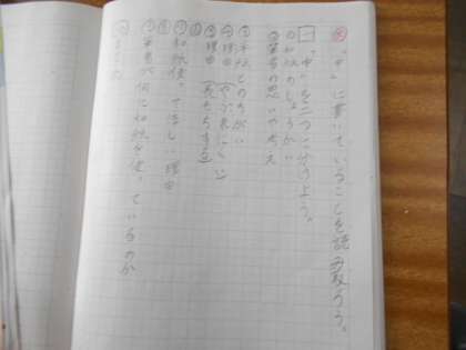 文章構成の「はじめ」「中」「終わり」の「中」をさらに2つに分けます。それぞれの段落に何が書かれているのかを短くまとめながら考えています。