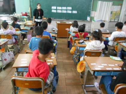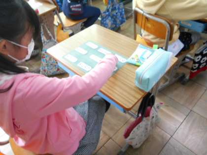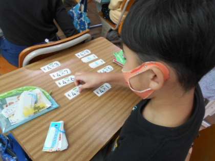計算カードを使って,九九のカルタとりです。先生の言った答えになる式が書かれているカードを探します。