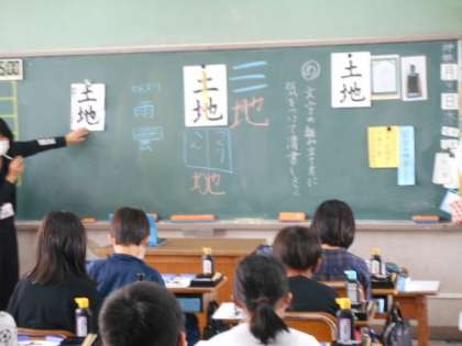 「土地」を毛筆書きます。文字の組み立てに気を付けて書いていきます。