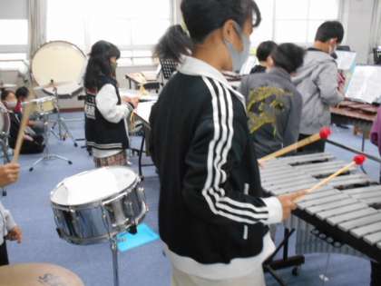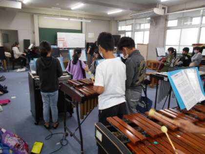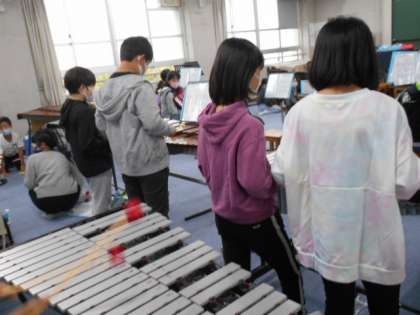 「キリマンジャロ」の合奏です。AグループとBグループに分かれて,旋律がよく聞こえるかどうかを確かめ合っています。