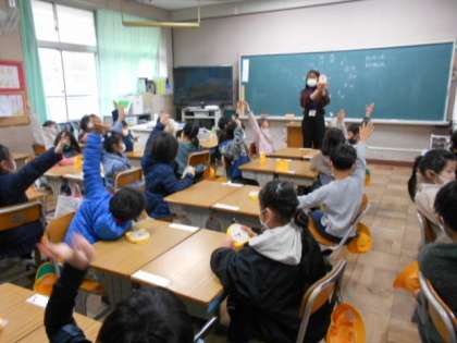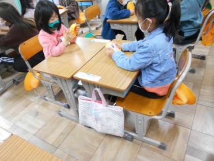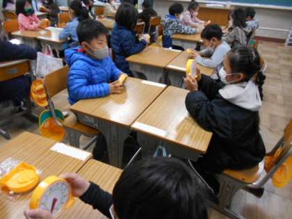 時計の読み方の練習をしています。友達とペアになって,時計の針を合わせ,その時刻をよみます。問題の出し合いをしています。