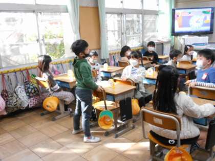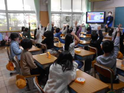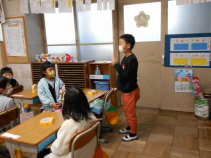 時計を使って,時刻を読みます。表示された時刻は「なぜ3時7分と読むのか」について,意見を出し合っています。