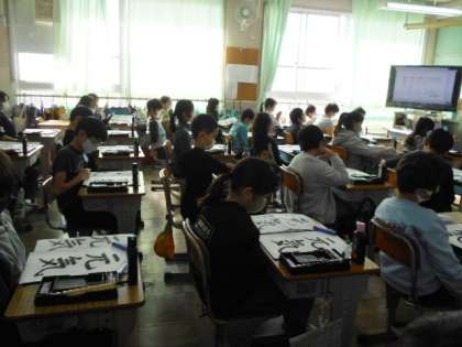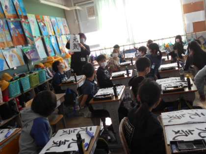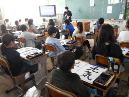 書初めの練習をしています。1枚書いた「元気」という文字を見て,うまくいったところを見付けています。
