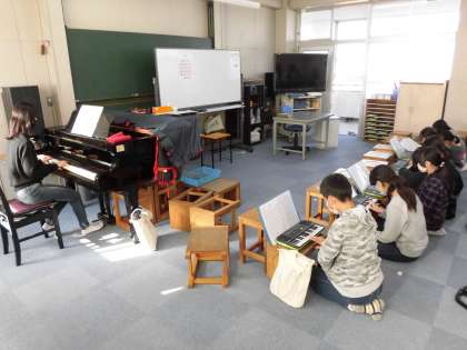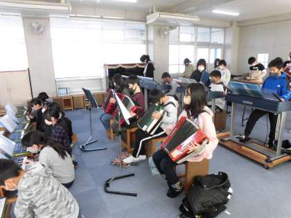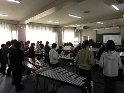 合奏をしています。楽器ごとにまずは自主練習をして,音合わせをしました。周りの音も確かめながら,自分の音もしっかりと出すよう練習していました。